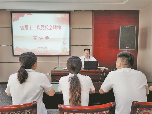 6月22日一早,省党代表、金年会电气股份有限公司党委书记、副总经理李明辉在党员活动室向公司党员宣讲党代会精神。